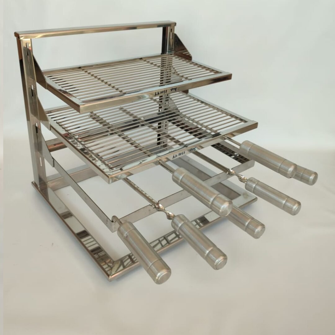 Contém: 1 suporte, 1 grelha degelo, 1 grelha aramada, 1 quadro para apoio de espetos.